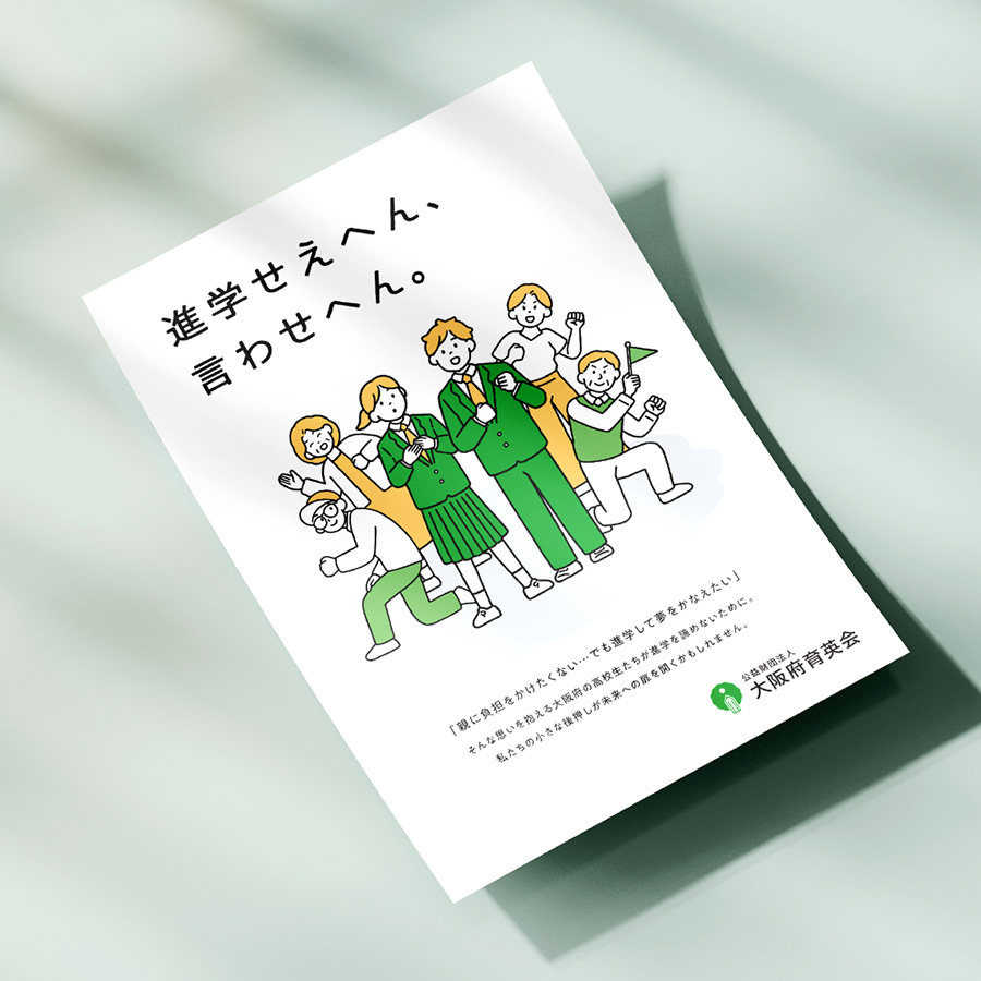 従来の層に限定せず、より多くの方から寄付を募りたいとのことで、インパクトのあるコピーとデザインで、チラシとポスターをリニューアルしたいとのご要望でした。 駅や商業施設での掲示、街頭でのチラシ配布に向けて、パッと目を引く端的なコピーとビジュアルを検討。ビジュアル面では希望に満ちた高校生をシンプルながらメッセージ性のあるイラストで描き起こしてもらいました。コピーは「大阪」というご当地色を出す意味でも、方言を用いて韻を踏むことで印象に残るものを考案。のちに「夢みらい奨学金」のキャッチフレーズとして、名刺やメールの署名欄にも活用していただきました。ポスターとチラシを気に入っていただけたことから、大阪メトロの吊り革広告制作にも繋がりました。